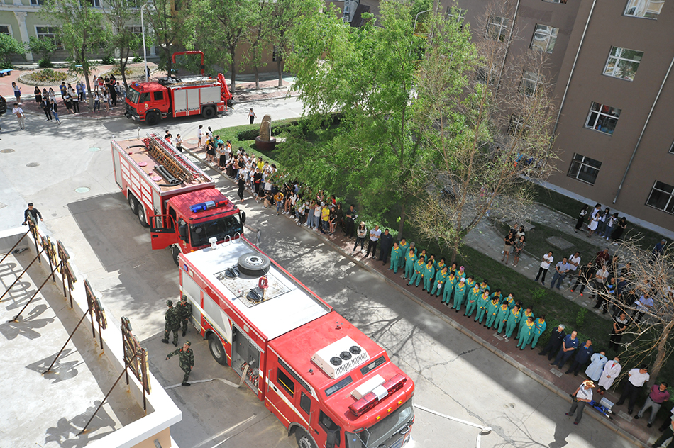 演练分为火情报警、接警处置、组织灭火、疏散逃生、火场救援五个环节。公寓楼长第一时间向保卫处报警,并迅速组织疏散学生,组成第一灭火梯队奔赴现场灭火。保卫处接警后立即启动消防泵直起按钮,报119火警,巡逻队携带灭火球迅速赶往现场救援,同时实施现场警戒,出口人员疏散,维护现场秩序。黑河市公安消防支队合作区消防大队官兵在接到学校的模拟报警后,立即出警,迅速组织灭火、救援。